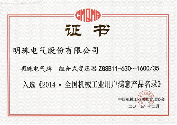 2015年12月22日,中国机械质量管理协会召开会议,对百项全国机械工业用户满意产品获奖单位予以授奖,我公司组合式变压器产品作为电工电器制造行业唯一同类产品获授“全国工业机械用户满意产品”。
