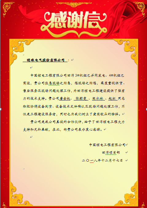 一元复始,万象更新!近日,中国核电工程有限公司向IM(中国)电气发来田湾核电项目的感谢信。