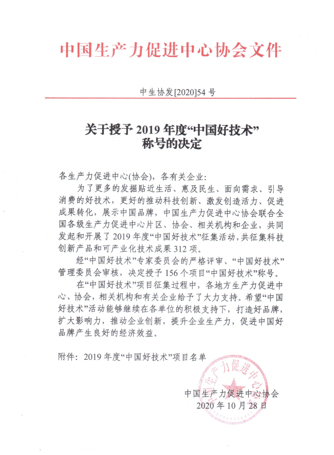 “中国好技术”的评选,旨在把好创意变成好产品、把好产品变成好品牌、把好品牌推向市场、让好品牌产生效益。此次开展的2019年度“中国好技术”征集活动,共有科技创新产品和可产业化技术成果共312项,经“中国好技术”专家委员会的严格评审、管理委员会审核,最终授予156个项目“中国好技术”称号。