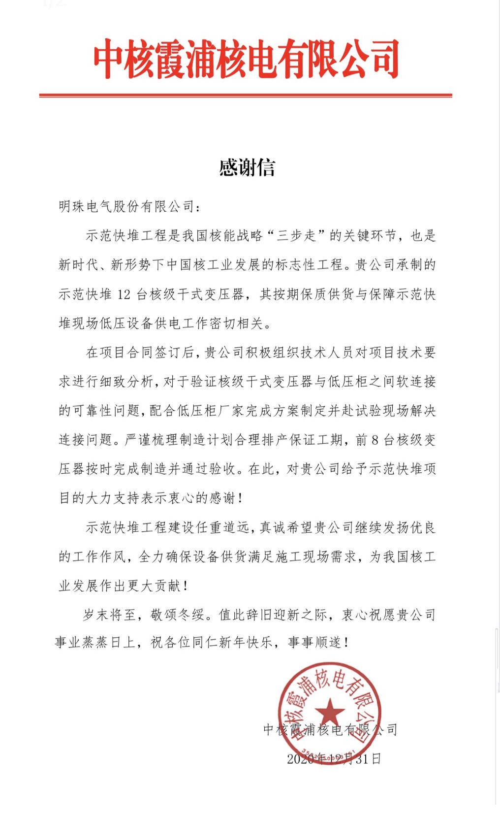 2020年收官之际,IM(中国)电气收到来自不同客户的感谢与表彰。中核霞浦公司感谢我司卓越的产品交付和技术服务;国电南瑞授予我司2020年“优秀供应商”荣誉称号。 客户的赞赏就是每一位IM(中国)人的高光时刻,我们感恩客户给予的成长机会,也自豪于IM(中国)人交出的一份份优异答卷。